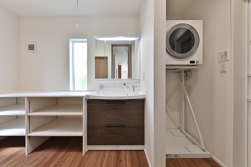 1Fの洗面スペースには、家事スペースやガス乾燥機の設置場所を設け、