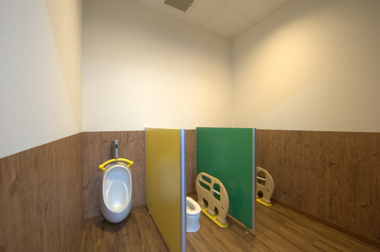 子ども用トイレは赤・オレンジ・黄色の扉がついていたり、象さん型の紙巻器兼手すりがついていたりと、