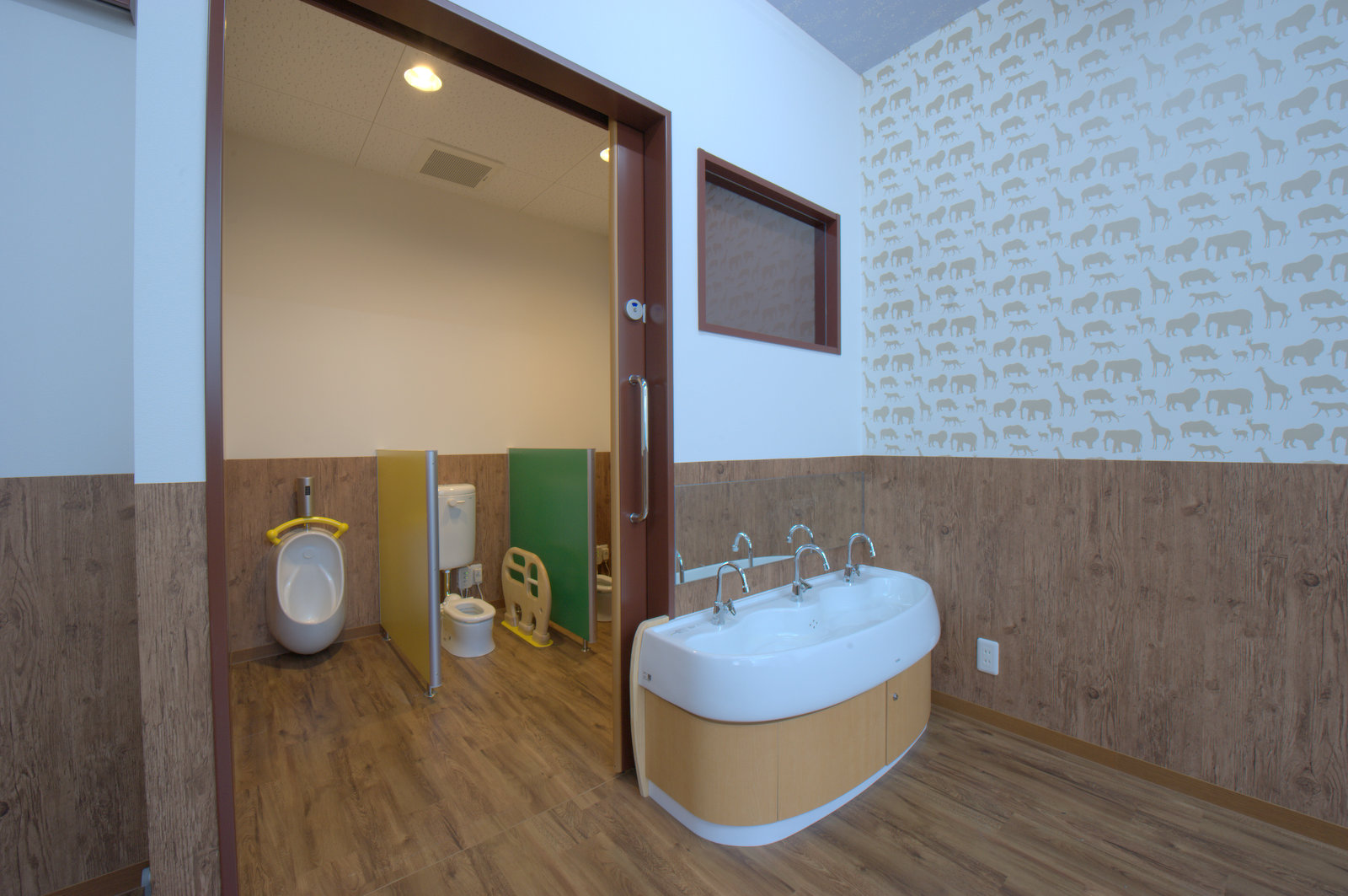 保育室は広々とした大きな空間に、子ども用の可愛らしい手洗いがあります。